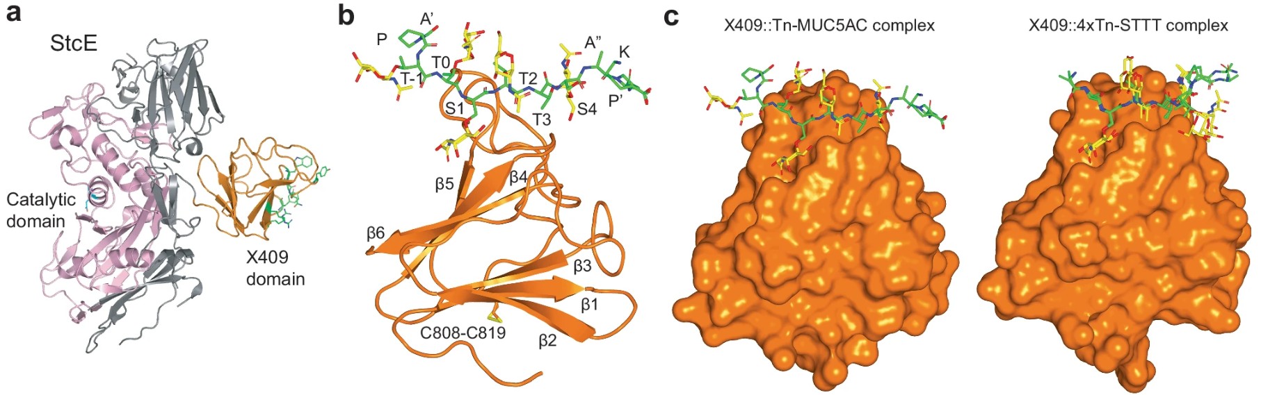 How mucins exert these effects is poorly understood and critical is how the microbiota recognize, sense, and break down mucins. Here, we provide structural molecular evidence that a small mucin-binding module designated X409 recognizes clustered saccharide patches comprised of rows of inner monosaccharides in adjacent O-glycans. These patches are unique to mucins and binding to these provides an elegant mechanism to retain adherence to mucins despite trimming of O-glycans during microbial scavenging of monosaccharides from mucins.